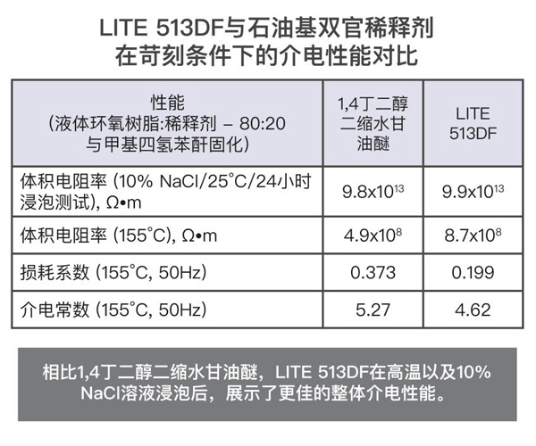 根據(jù)iec 62631和iec 60243標(biāo)準(zhǔn)進(jìn)行測(cè)試,如其介電性能所示,lite 513df提供了良好的絕緣性能。在epon 828的配方中,樹脂的使用量為20%,用mthpa(甲基四氫鄰二甲酸酐)固化,并用bdma(芐基二甲胺)催化。lite 513df展示了優(yōu)異的結(jié)果,其體積電阻率和介電強(qiáng)度更高,損耗因數(shù)和介電常數(shù)比競(jìng)品1,4丁二醇二縮水甘油醚更低。當(dāng)兩種稀釋環(huán)氧樹脂體系都暴露于高溫或鹽溶液中時(shí),lite 513df的性能優(yōu)于石油基雙官能稀釋劑。lite 513df是一款良好的環(huán)氧稀釋劑和改性劑,適用于電氣灌封、鑄造和封裝(浸漬樹脂)。